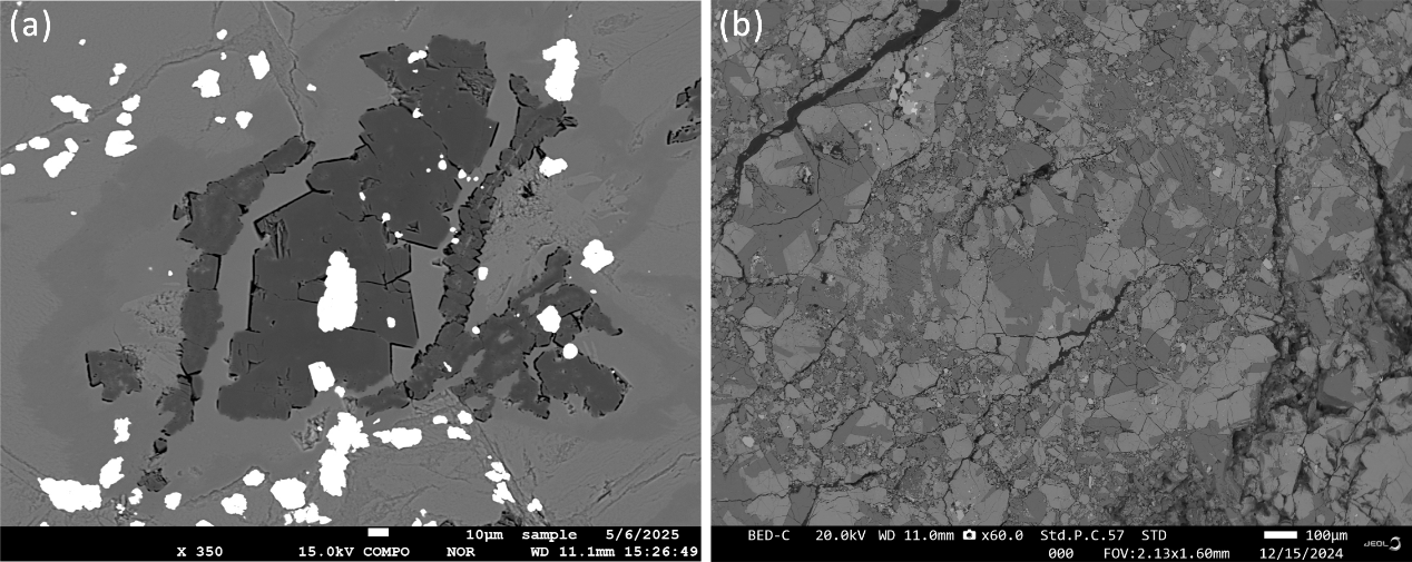 电子探针表针岩石结构及微区矿物组合。(a)蛇纹石化橄榄岩中的水镁石和磁铁矿;(b)陨石。
