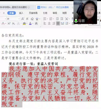 活动第二阶段为支部主题党日活动。由于科级干部调整,原来机关党支部组织委员王宁调出太阳成集团122ccvip,重新推举郭霖同志为组织委员。各位党员自觉交纳了4月党费,并在马书记带领下,全体党员利用屏幕共享和手机语音重温了入党誓词,这也是疫情防控工作中一次特别的党员宣誓。紧接着,大家集中学习重要会议文件精神:3月4日中共中央政治局常务委员会会议精神、3月6日决战决胜脱贫攻坚座谈会精神、习近平在湖北省考察新冠肺炎疫情防控工作时的讲话精神、3月18日中共中央政治局常务委员会会议精神、3月27日中共中央政治局会议精神和公司2020年工作会议精神。随后,马书记传达了公司4月份中心组学习及党委扩大会议精神,主要通报了2020年公司的重点工作,对近期的重点工作进行提醒。活动最后,大家还围绕“结合疫情防控谈共产党员如何在公司双一流建设中发挥作用”开展研讨。每位机关人员都结合自己的实际从疫情防控、日常工作、学科和公司发展3个方面进行讨论,并达成一致工作态度:保安全、抓落实、谋发展。