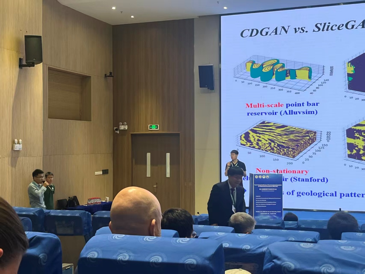 会上,谢鹏飞特聘副教授以《Conditional Generative Adversarial Networks (cGANs) Inversion method for Low-Uncertainty Hydrocarbon Reservoir Modeling》为题作口头汇报。储层预测普遍面临数据稀疏性、多模态数据融合及不确定性三大核心挑战。对此,提出了一套集成智能工作流程:首先构建地质知识库生成二维/三维训练数据集,缓解数据稀疏问题;其次搭建含渐进式增长架构与数据融合模块的增强型cGAN,整合多模态数据实现条件约束建模;最后采用基于反演的采样方法匹配观测数据,降低不确定性。