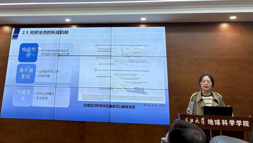 金思敏特任教授围绕古新世–始新世极热事件期间轨道尺度水循环重建与模拟这一主题,系统阐述了PETM时期水循环的关键特征。研究以北海盆地23/16b-9钻孔为对象,对其中210层浊积砂岩开展了精细的周期性统计分析,并运用三种时间序列分析方法进行深入探讨。结合已有年代模型,研究揭示出PETM时期北海盆地浊积砂岩的沉积过程明显受到地球轨道岁差周期的调控。进一步借助挪威地球系统模式进行数值模拟,结果表明该时期水循环的周期性波动,很可能源于轨道强迫作用下夏末秋初强降水事件的显著增强。