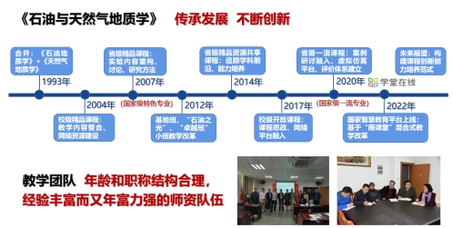 课程前身是《石油地质学》,1954年由著名石油地质学家、“陆相生油理论”主要创立者潘钟祥教授创建。1993年公司由原来的《石油地质学》和《天然气地质学》合并为《石油与天然气地质学》。历经几代人30余年的传承发展与持续创新,课程于2004年获批公司精品课程、2007年获批湖北省精品课程、2014年获批湖北省精品资源共享课、2020年获批湖北省首批一流本科课程,2022年建成在线开放课程上线学堂在线国家智慧教育平台。
