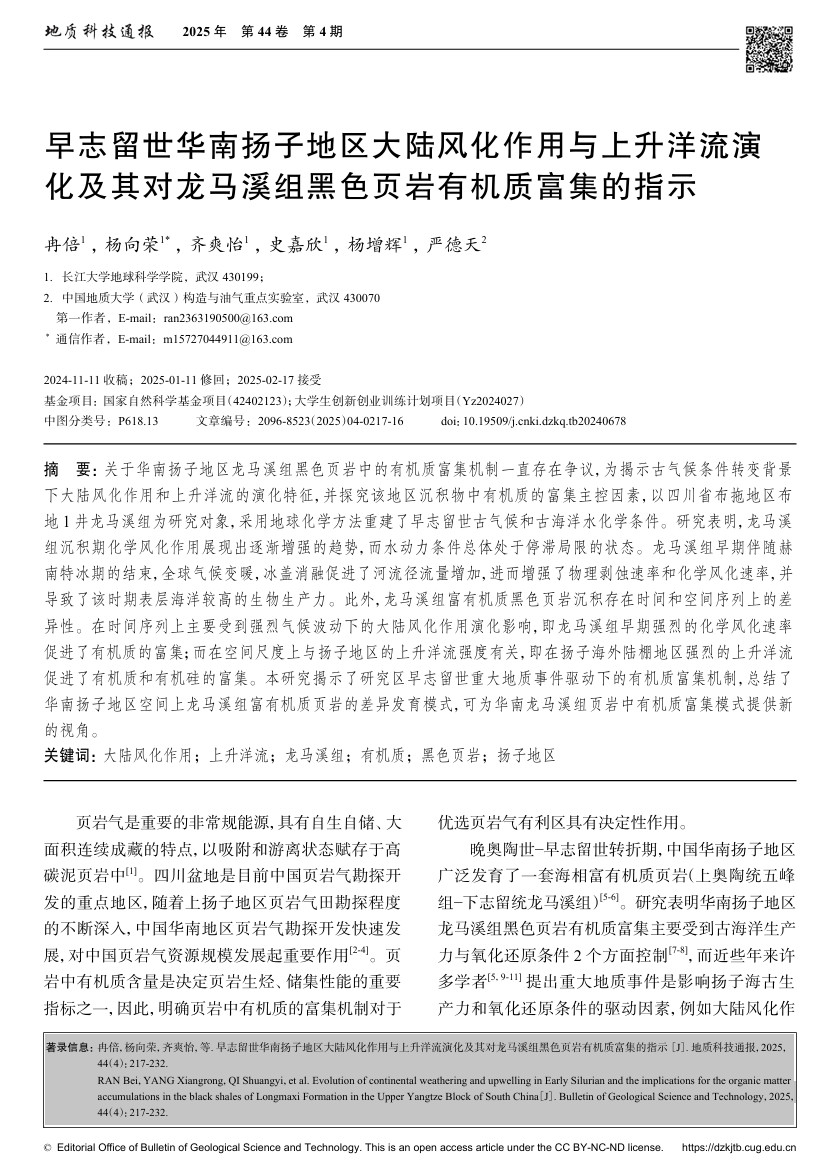 太阳成集团122ccvip22级本科生冉倍在核心期刊《地质科技通报》上发表了题为《早志留世华南扬子地区大陆风化作用与上升洋流演化及其对龙马溪组黑色页岩有机质富集的指示》的论文(共20页)。本科生冉倍为论文第一作者,其导师杨向荣为通讯作者。文章重点讨论了大陆风化作用与上升洋流影响下,早志留世华南扬子地区龙马溪组黑色页岩有机质富集机制。