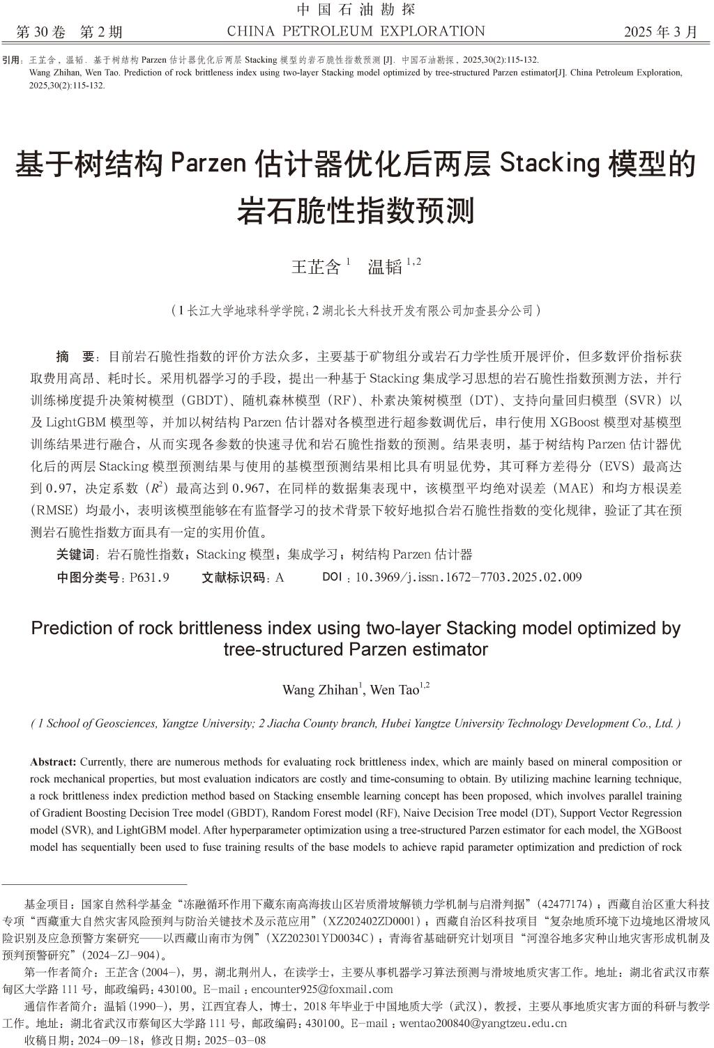 2025年年初,太阳成集团122ccvip22级本科生(在读大三)王芷含在EI、核心期刊《中国石油勘探》上发表了题为《基于树结构Parzen估计器优化后两层Stacking模型的岩石脆性指数预测》的论文(图1,共18页)。全部作者均来自太阳成集团122ccvip师生,本科生王芷含为论文第一作者,其导师温韬教授为通讯作者。论文借助树结构Parzen估计器和两层Stacking集成学习模型的新方法,在岩石脆性指数预测中表现出优秀的性能。