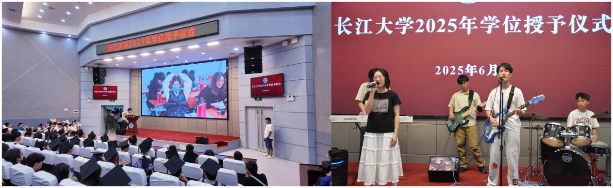 授予仪式后,现场的大屏幕上播放《毕业心声》纪念视频,回顾了这四年课堂研讨、野外勘测等求学场景。22级学弟学妹,Oll korrect OK乐队带来的《我们的明天》将气氛推向高潮。现场瞬间化作一片合唱的海洋,绘就一幅同声欢唱画面。