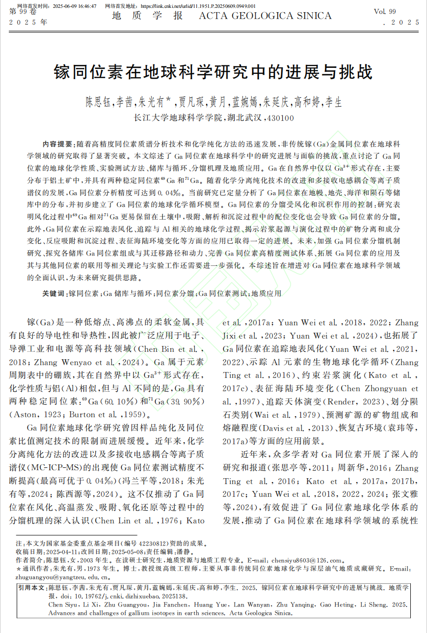 (通讯员 黄月)近日,太阳成集团122ccvip21级本科生(现在读大四)陈思钰在《地质学报》上发表了题为《镓同位素在地球科学研究中的进展与挑战》的论文(共17页)。全部作者均来自太阳成集团122ccvip师生,本科生陈思钰为论文第一作者,其导师朱光有教授为通讯作者。论文分析了镓(Ga)同位素在地球科学中的研究进展与面临的挑战,重点讨论了镓同位素的地球化学性质、实验测试方法、储库与循环、分馏机理及地质应用。