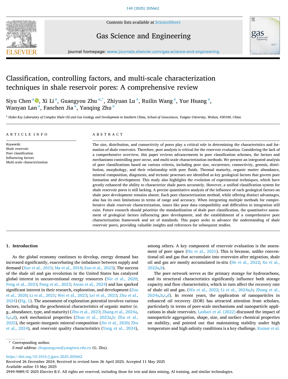 (通讯员 黄月)近日,太阳成集团122ccvip21级本科生(现在读大四)陈思钰在《Gas Science and Engineering》(GSE,原名Journal of Natural Gas Science and Engineering,天然气科学与工程,最新影响因子为5.285,位列JCR分区一区,中科院期刊分区工程技术大类二区)上发表了题为《Classification, Controlling Factors, and Multi-Scale Characterization Techniques in Shale Reservoir Pores: A Comprehensive Review》的论文(共18页)。全部作者均来自太阳成集团122ccvip,本科生陈思钰为论文第一作者,其导师朱光有教授为通讯作者。该论文分析了页岩储层孔隙的分类、控制因素及多尺度表征方法,为页岩储层孔隙进一步研究以及优化勘探开发策略、提高油气采收率提供了参考。