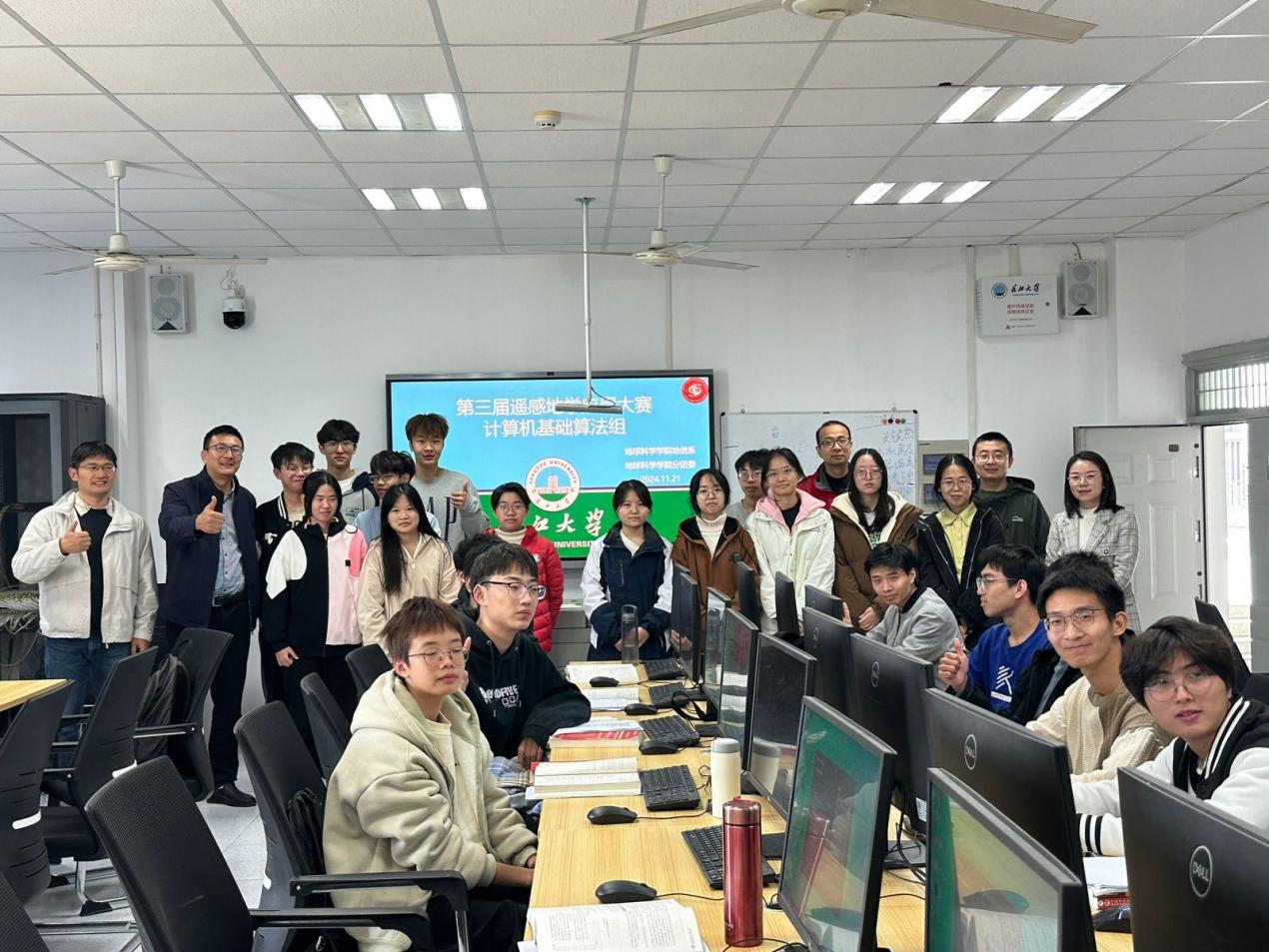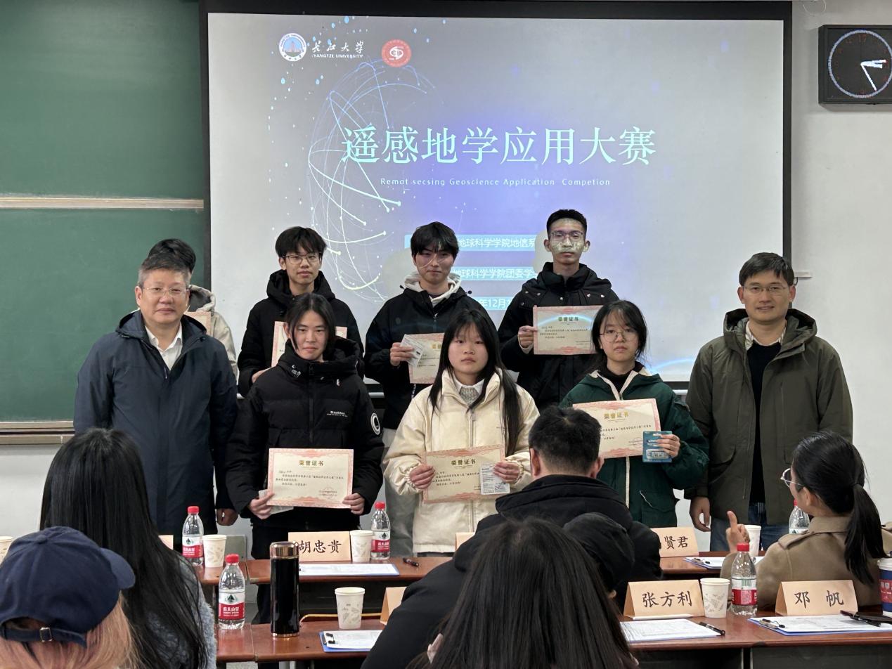 最终,“计算机基础算法组”11人获优胜奖,“遥感应用分析组”孙浩宇组获得一等奖,邱振翔组、饶旭乾组和石赵雄组获“二等奖”,刘海川组、丁百娇组、张家然组、李龙凡组获“三等奖”。评委老师依次为获奖选手颁奖,并合影留念。