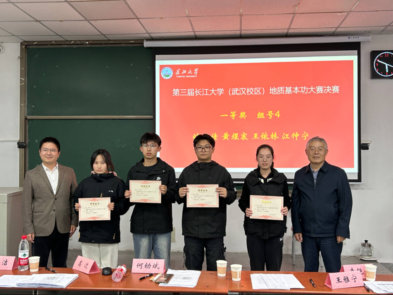 最终,储思佳队荣获一等奖,何文凯队等四支队伍获二等奖,郭辉辉队等六支队伍获三等奖。储思佳和孙梦琪两位同学获“最佳岩石薄片鉴定奖”,黄煜宸获“最佳古生物化石鉴定奖”。评委老师依次为获奖选手颁发奖状与奖品,并与获奖同学合影留念。