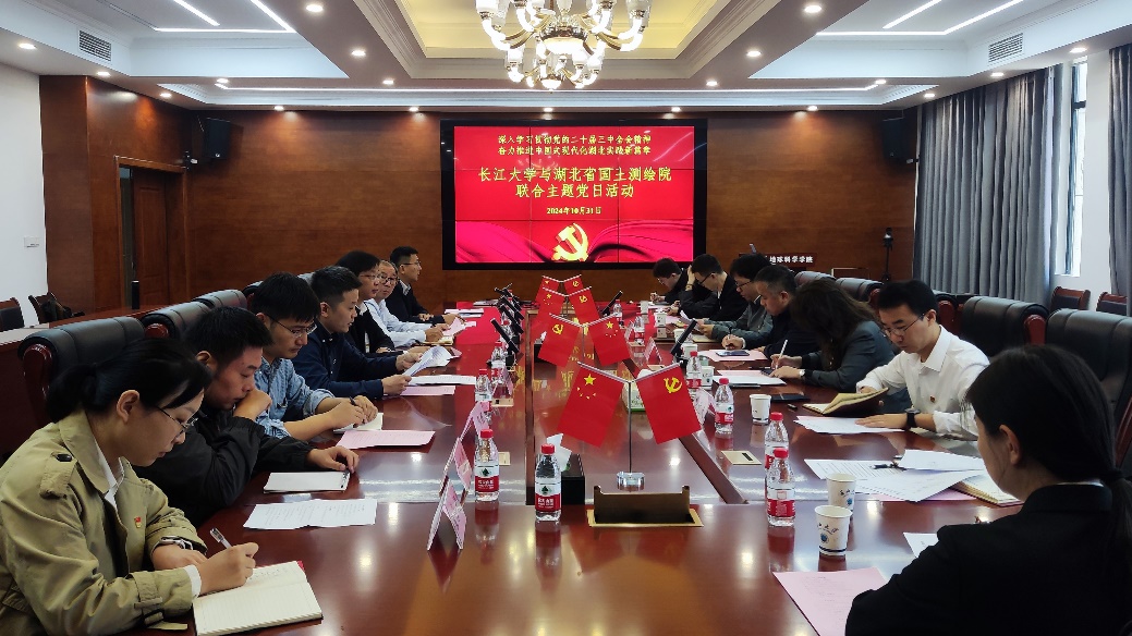 (通讯员张方利)2024年10月31日上午,公司地信系教工党支部与湖北省国土测绘院航测遥感中心党支部、国土空间规划中心党支部开展了联合主题党日活动,活动以“深入学习贯彻党的二十届三中全会精神,奋力推进中国式现代化湖北实践新篇章”为主题,党建引领,业务融合,深入交流,共谋发展。湖北省国土测绘公司党委委员、副经理熊中招,航测遥感中心党支部书记、主任谢菲,国土空间规划中心党支部书记、主任杨莉,公司党委书记杨全辉,副经理李功权,地信系教工党支部书记邵燕林,地信系主任刘远刚及双方部分党员代表参加了此次联合主题党日活动,地信系教工党支部书记邵燕林主持活动。