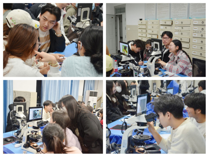 12月8日晚七点,“地质标本鉴定”类比赛在实验楼A406如期举行,地科系尚成、严溶老师,学工办姚佳、黄瑱老师参加活动。同学们借助显微镜,对岩石薄片进行仔细观察和分析,大家聚精会神,一边在实验记录本上做着详尽的笔记,一边积极讨论力求完善分析结果。最终,每个队伍在规定时间内完成实验报告的撰写并提交给评委老师评定。