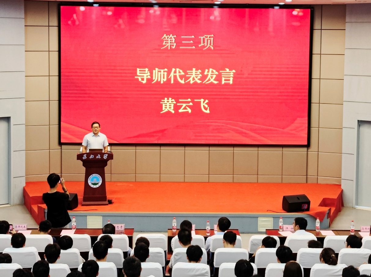 随后,导师代表黄云飞副教授以自己培养的研究生为例,鼓励同学们在读研期间积极投入学习,主动查看文献,多向导师请教,探究相关领域的最新研究成果,深化自己的学术见解,充实自己的知识体系,以期将来成为更加出色的专业人才。