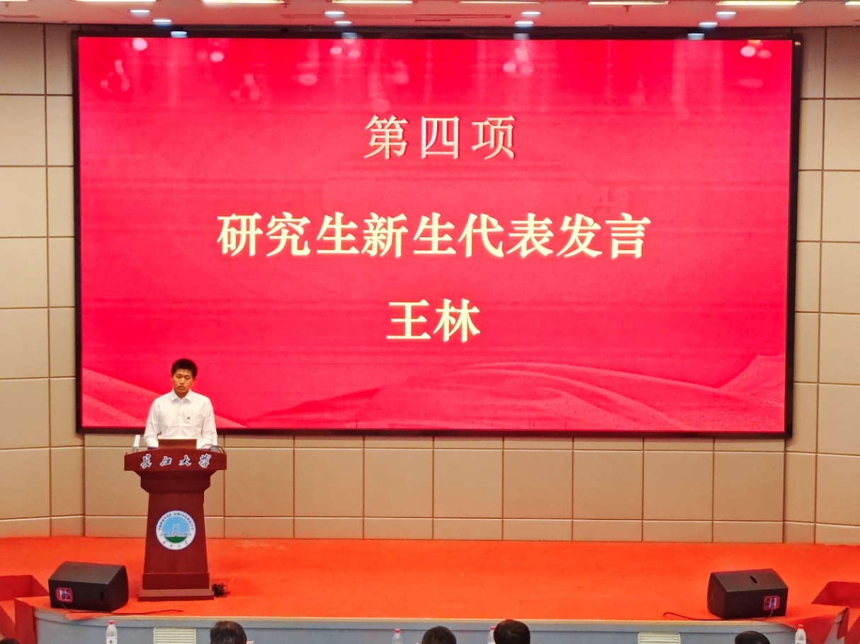 之后,来自地质QX231班的王林同学作为研究生新生代表发言,“蓝天、艳阳、碧水,能在诗一般的长大校园中挥洒人生中最纯粹的时光,我们是如此幸运。这是人生驿站,更是成功的起航,愿所有的我们都能破浪前航,创造新的辉煌!”