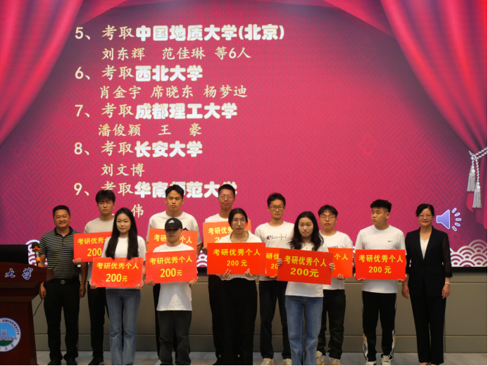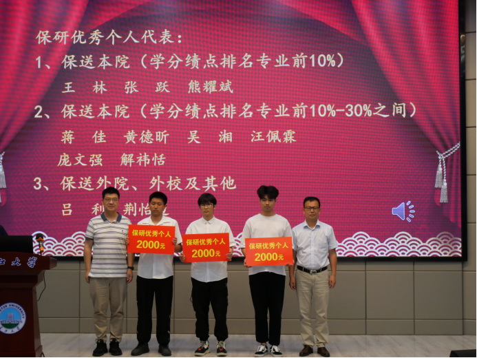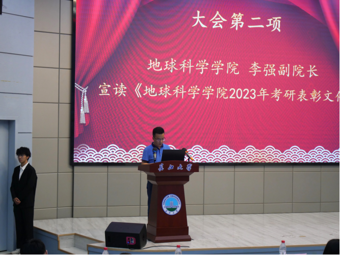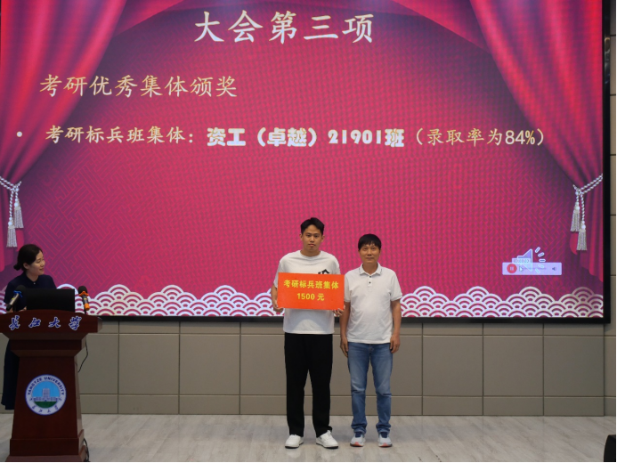 会议在隆重的国歌声中拉开帷幕。副经理李强宣读《太阳成集团122ccvip2023年考研表彰文件》,1个考研标兵班级、6个标兵宿舍、2个标兵个人,和43名优秀个人依次上台领奖。