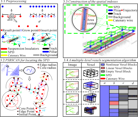 高铁接触网支持定位装置受使用频率及外界环境的影响,部件损坏率极高。因此,自动稳健的支持定位装置检测和状态评估对保障铁路安全运营具有重要研究意义,然而铁路场景的复杂多样性使得点云规模占比较小的支持定位装置特征模型刻画能力较弱。当经典点云分割算法应用于铁路点云数据集时,存在分割精度低、自动化程度低、适用性差等缺陷,难以迁移应用到不同铁路线场景中。该论文中提出了一种新的能够适用不同铁路场景的接触网支持定位装置提取算法。首先,针对接触网相关部件点云密度不均以及点云处理效率低的问题,提出了新的PSBSCAN(Point-Spacing-Based Spatial Clustering of Applications with Noise, PSBSCAN)聚类算法,实现支柱点云的高效聚类提取;然后,构建面向设施对象的空间索引,以实现铁路场景中POS轨迹、支柱及支持定位装置点云对象的快速定位检索;最后,基于改进八叉树构建多层次体素分割框架,对架设在支持定位装置上的接触线进行剥离,实现复杂铁路场景中支持定位装置的精确提取。实验结果表明,与同类算法相比,该方法具有较强的抗干扰能力和良好的支持定位装置提取能力,算法模型具有良好的可扩展性和轻量化特性,方法能有效运用于铁路支持定位装置运维作业。