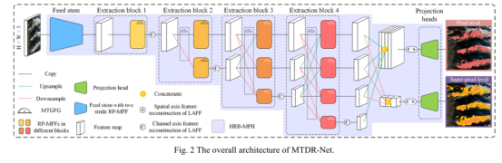 高分辨率遥感影像平均约66%的区域会被云层覆盖。因此,精确的云检测对遥感影像的预处理至关重要。由于传统云检测方法应用于高海拔、高纬度地区时,受到积雪的相似反射特征和局部纹理的干扰,对云检测造成困难,使得基于云雪共存区域的云检测工作相较于其他场景更具挑战性。论文中提出了一种多任务驱动的可重构深层神经网络(MTDR-Net)。MTDR-Net中有4个模块:高分辨率骨干-多投影头模块(HRB-MPH)、可重参数化多尺度特征融合模块(RP-MFF)、轻量化自适应特征融合模块(LAFF)和多任务梯度流引导模块(MTGFG)。HRB-MPH促进了全局信息交互,增强了多粒度特征表示,支持像素级和超像素级分割任务之间的特征共享。RP-MFF能在训练阶段捕获局部多尺度云特征,且在测试部署阶段无损地简化结构。LAFF能重建云特征。MTGFG在多任务梯度流之间提供无偏指导。实验结果表明,相比于同类算法,该方法具有较强的抗干扰能力和良好的云边界和薄云提取能力,获得了最佳的云检精度。模型具有良好的可扩展性和轻量化特性,能有效运用于遥感影像实际生产作业。该研究成果为超高分辨率遥感影像云雪共存区的云检测工作提供指导。