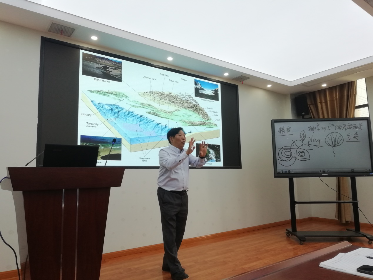 讲座正式开始,于教授给所有人提出了八大沉积地质学问题,这种开题的方式,着实新颖,紧紧抓住了台下每一位师生的注意力。于老师通过简单的现象,引发员工以系统地质思维思考常见的地质现象,这是日常课堂中难以学习到的。于教授结合几十年的科研、生产与教学经验,以碎屑岩沉积相为讲授主题,以成因为主导,系统介绍了如何对碎屑岩沉积相进行系统研究,具体介绍了:岩心观察的科学方法、井震结合划分层序、小层对比原则、平面沉积相图编制方法等。通过具体案例分析,于教授总结出了若干条地学哲学思维并分享给大家,如科学证据是基础、地质模式为导向、微观向宏观分析、宏观向微观思维、现象描述为外延、成因分析为内涵,这些深刻的哲学思维引发了在座师生的强烈反响,为我们今后的学习与科研提供了思想指导。