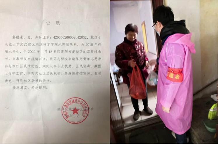 “看到一批批白衣天使驰援湖北,各级干部职工放弃春节假期自愿投身到抗疫一线,我深受触动。”地信21802班的郭继豪征得父母同意后,2月27日至3月16日作为青年志愿者参与到家乡疫情防控工作中。