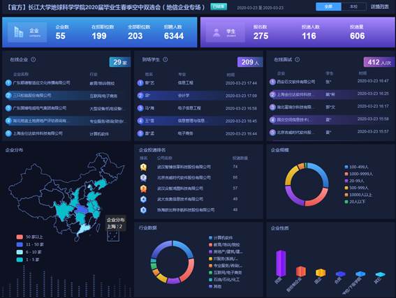 会后根据后台反馈数据,对空中双选会中企业投递类型、最受欢迎的公司进行了分析,同时对本院地信专业员工参会及面试情况进行了调查,了解到较多员工都收到了企业的面试邀约,更有部分同学因为时间有限,单位和员工另行约定了时间进行面试。来自地信21601班的王荟奥今天面试了两家企业,他表示这种线上双选会比较轻松,一定程度上缓和了与面试官面对面的紧张感,而且线上双选会选择机会比较多。