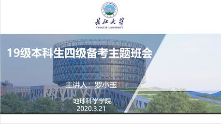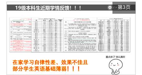 在主题班会开始之前,罗老师对开学以来19级本科生的网络学习情况及上学期期末考试情况分别进行了通告与分析,得出线上学习存在自律性差、学习效果不佳和公司19级本科生英语基础薄弱的现状,引导家长、员工重视英语学习和四级备考。