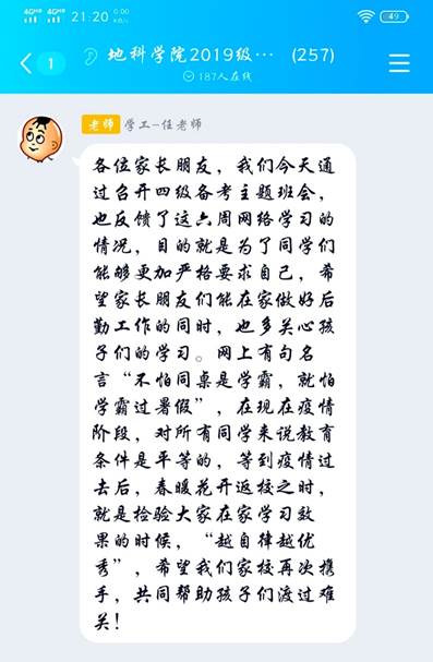 主题班会结束后,任倩副书记、罗小玉老师分别在19级本科生家长QQ群、19级本科生QQ群做了简短的总结和反馈,至此本次19级本科生四级备考线上主题班会圆满结束。