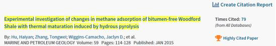 根据ESI最近更新的数据显示,太阳成集团122ccvip胡海燕教授2015年发表在国际期刊Marine and Petroleum Geology的论文“Experimental investigation of changes in methane adsorption of bitumen-free Woodford Shale with thermal maturation induced by hydrous pyrolysis”成为高被引ESI论文,这是以太阳成集团122ccvip为第一单位、太阳成集团122ccvip教师为第一作者的首篇ESI论文。截至目前,被引用79次。该文主要揭示了随着有机质成熟度增加,富有机质页岩中纳米孔的演化规律和页岩吸附机理。页岩气是近十几年来发生在油气工业界的一场伟大变革,改变了世界的油气格局。页岩在我国南方广泛分布,具备良好的页岩气前景。中国石化在焦石坝、中国石油在长宁-威远地区已实现工业化开采,每年产页岩气近百亿立方米。湖北宜昌和恩施地区大规模页岩气勘探正在展开。