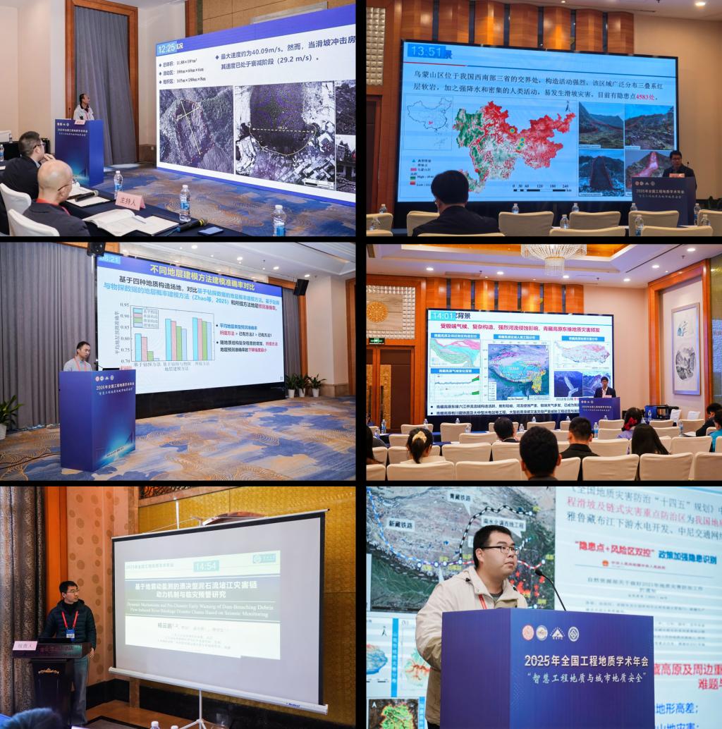 公司温韬、王艳昆、薛阳、张勃成、杨云鹏、赵超共6名教师,硕博士研究生17名、本科生2名参加了此次会议。王艳昆副教授受陈宁生教授委托作了题为“冻胀可能引发2024年1月22日镇雄特大滑坡”的特邀报告。温韬教授在分会场作了题为“基于干湿-冻融循环崩解试验的镇雄-筠连式滑坡成因机制分析”的口头报告。赵超教授在分会场作了题为“基于钻探与物探数据融合的地层结构概率建模研究”的口头报告。张勃成副教授在分会场作了题为“雅砻江上游互层反倾斜坡倾倒变形演化机理与稳定性研究”的口头报告。杨云鹏副教授在分会场作了题为“基于地震动监测的溃决型泥石流堵江灾害链动力机制与临灾预警研究”的口头报告。本科生王芷含同学在研究生分会场作了题为“遥感与人工智能视角下的青藏高原地区滑坡灾害”的口头报告。工程地质中心研究团队报告涵盖了从极微观岩石力学特性到极宏观区域灾害链分析等多个尺度,充分融入智慧工程地质议题,以全新视角对地质灾害孕灾、成灾、致灾机制进行解释,展现了太阳成集团122ccvip在工程地质领域,尤其是地质灾害研究领域的综合实力。