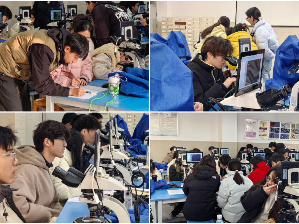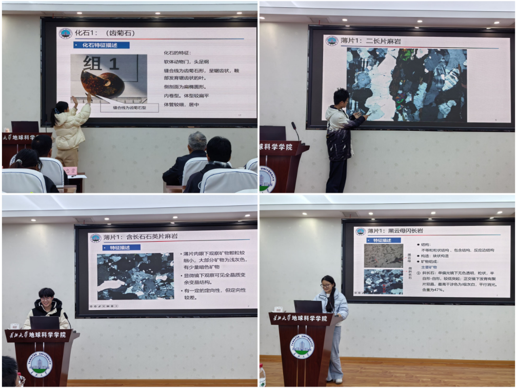 决赛当天的赛程紧张而充实,是对选手们脑力与体力的双重考验。上午,选手们首先在显微镜实验室进行“硬碰硬”的技能比拼, 需要在规定时间内对一组岩石薄片和古生物标本进行精细鉴定,并完成翔实的实验报告。随后,选手们进入机房,将鉴定成果转化为PPT,这一过程考验了大家的信息技术应用与成果整合能力。