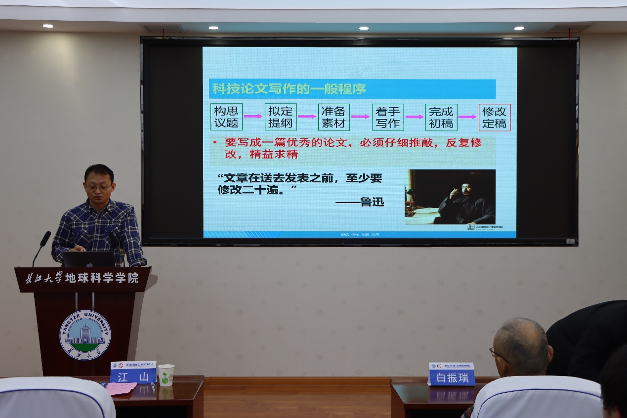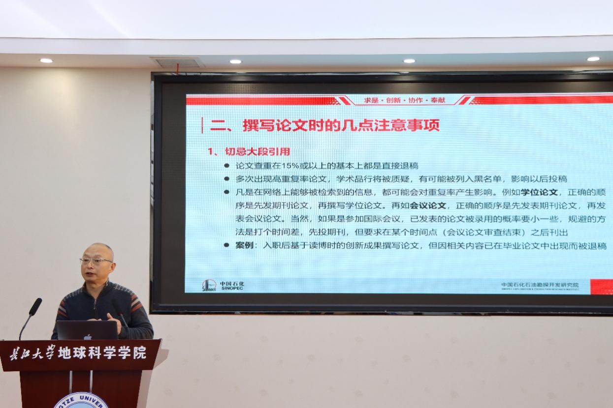 (通讯员 卢志远 胡静怡 范秀武/摄)2026年1月10日,特别邀请石油地质领域知名期刊《石油与天然气地质》和《Energy geosciences》执行主编白振瑞教授、副主编张亚雄教授,在石油科技大楼C301会议室为武汉校区师生作题为《高水平科技论文写作与期刊投稿技巧》的专题讲座。会议由公司副经理江山教授主持,胡明毅教授、卢志远特任教授等100余位师生参加了此次报告会。