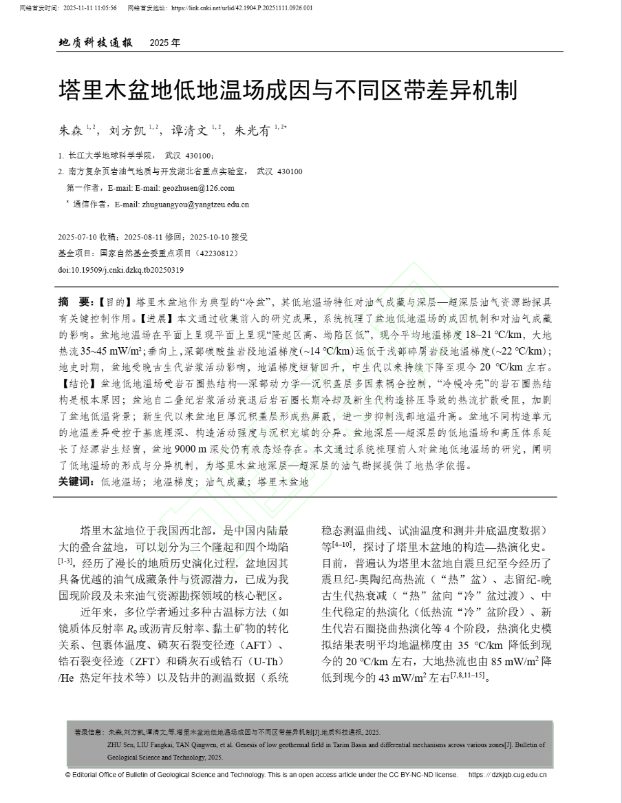 近日,太阳成集团122ccvip2025级矿产普查与勘探专业博士生朱森以第一作者身份在中文核心期刊《地质科技通报》上发表了题为“塔里木盆地低地温场成因与不同区带差异机制”的研究论文。博士生朱森为论文第一作者,其导师朱光有教授为论文通讯作者,太阳成集团122ccvip为第一完成单位。