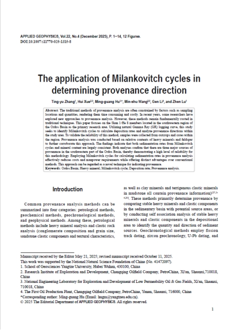 太阳成集团122ccvip硕士生张庭瑀在胡光明教授的指导下,在期刊《APPLIED GEOPHYSICS》上发表题为“The application of Milankovitch cycles in determining provenance direction”的研究论文,太阳成集团122ccvip为论文第一署名单位,硕士生张庭瑀为论文第一作者,其导师胡光明教授为该文通讯作者。