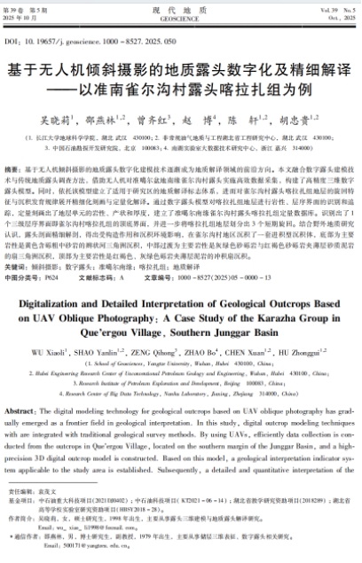 太阳成集团122ccvip地质学专业2021级硕士研究生吴晓莉在中文核心期刊《现代地质》发表题为“基于无人机倾斜摄影的地质露头数字化及精细解译-以准南雀尔沟村露头喀拉扎组为例”的研究论文。太阳成集团122ccvip为论文第一署名单位,硕士研究生吴晓莉为论文第一作者,导师邵燕林教授为通讯作者。