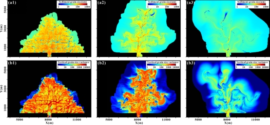 通过沉积数值模拟技术,再现了三类三角洲的沉积演化过程(图2)。基于模拟所得沉积界面与粒度数据,重构了其沉积构型与粒度分布模型,进而通过精细解析演化过程,建立了浅水三角洲的沉积构型模式,并阐明了模式框架下的沉积非均质性特征。