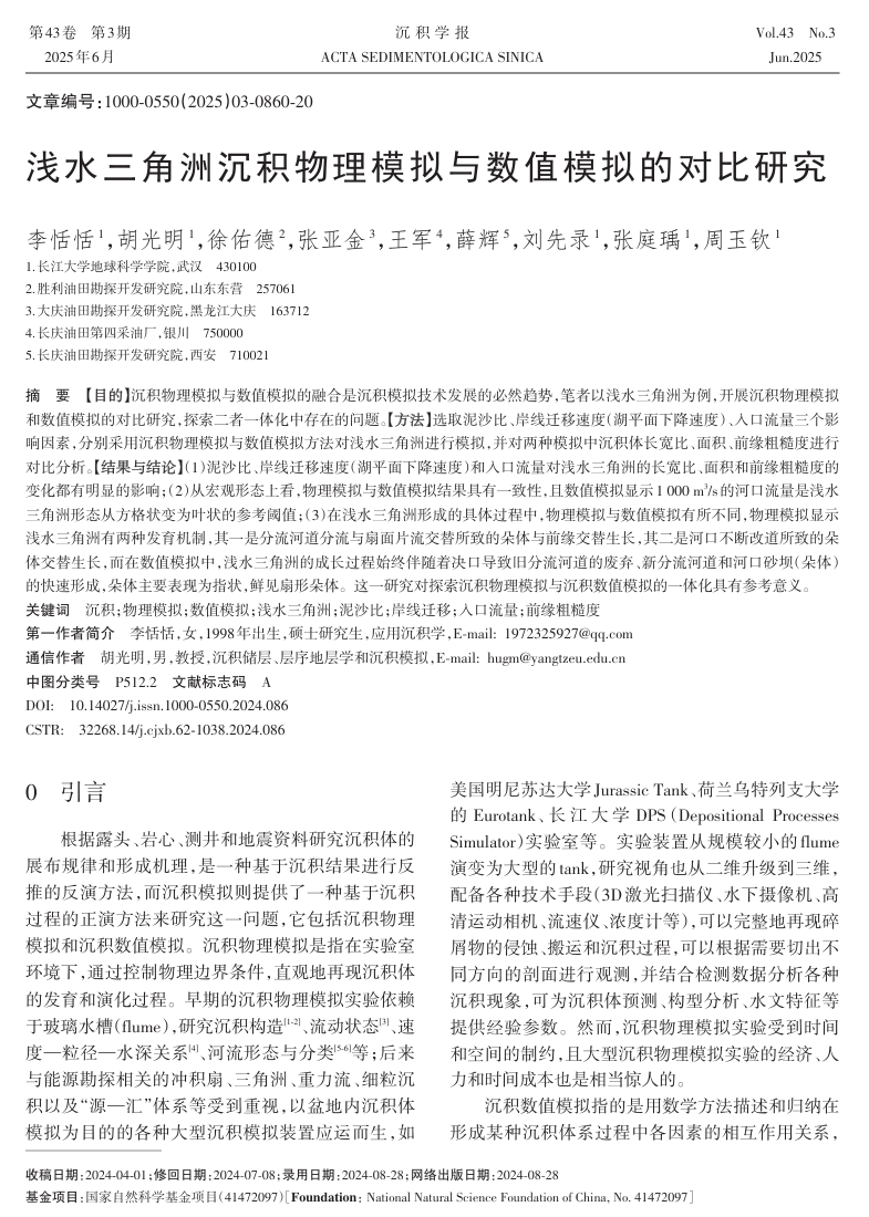 近日,太阳成集团122ccvip2020级研究生李恬恬在核心期刊《沉积学报》上发表了题为《浅水三角洲沉积物理模拟与数值模拟的对比研究》的论文(共20页)。研究生李恬恬为论文第一作者,其导师胡光明教授为通信作者。论文重点讨论了浅水三角洲发育的控制因素、沉积演化规律、形态展布特征等,比较物理模拟和数值模拟结果的相似性。