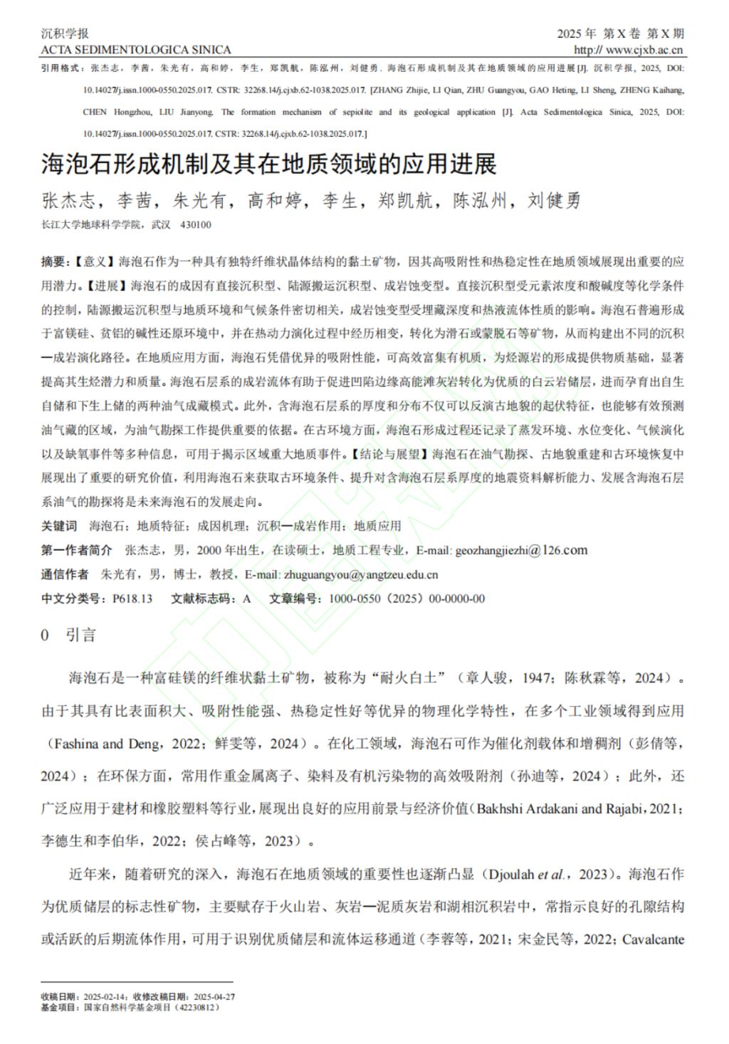 近日,太阳成集团122ccvip24级研究生张杰志在核心期刊《沉积学报》上发表了题为《海泡石形成机制及其在地质领域的应用进展》的论文(共32页)。全部作者均来自太阳成集团122ccvip师生,研究生张杰志为论文第一作者,其导师朱光有教授为通信作者。论文重点讨论了海泡石的地质特征、成因机制、沉积—成岩的关系以及在地质领域的应用。