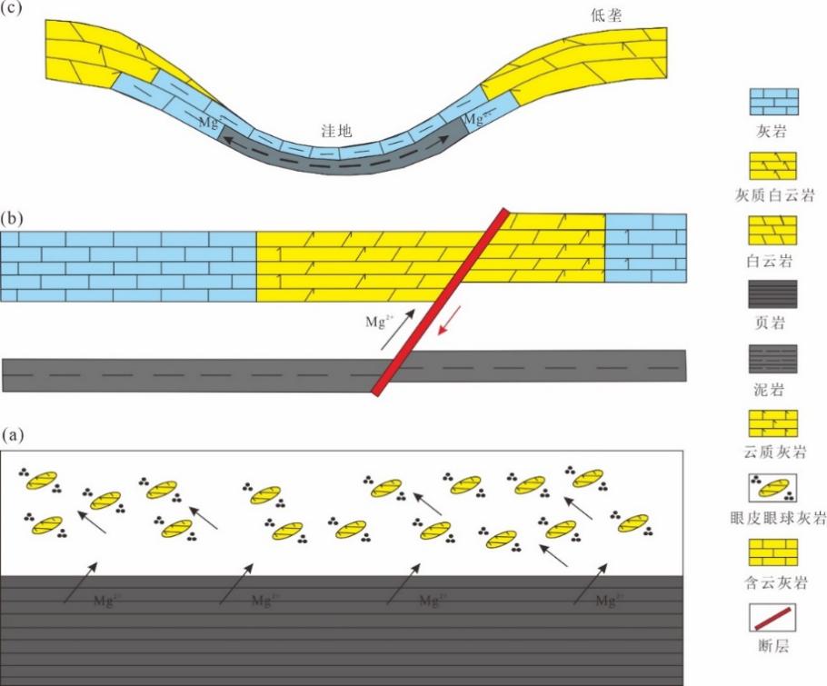 海泡石在油气勘探、古地貌重建及古环境恢复中具有重要的研究价值。其优异的有机质吸附能力,有助于提升烃源岩的有机丰度和生烃潜力。成岩演化过程中,海泡石能形成多样化的孔隙网络,构建有效的渗流通道和储集空间,促进油气的富集与保存。同时,海泡石层系的成岩流体促使凹陷边缘高能滩灰岩白云石化,形成优质储层,支撑自生自储与下生上储的两种成藏模式(图2)。在古地貌方面,含海泡石层系的累积厚度与地层总厚度呈负相关,为油藏的预测提供依据。此外,海泡石对气候和水文条件有良好指示作用,其微量元素特征还能与区域重大地质事件相对应,进一步拓展了其在古环境与地质历史重建中的应用潜力。