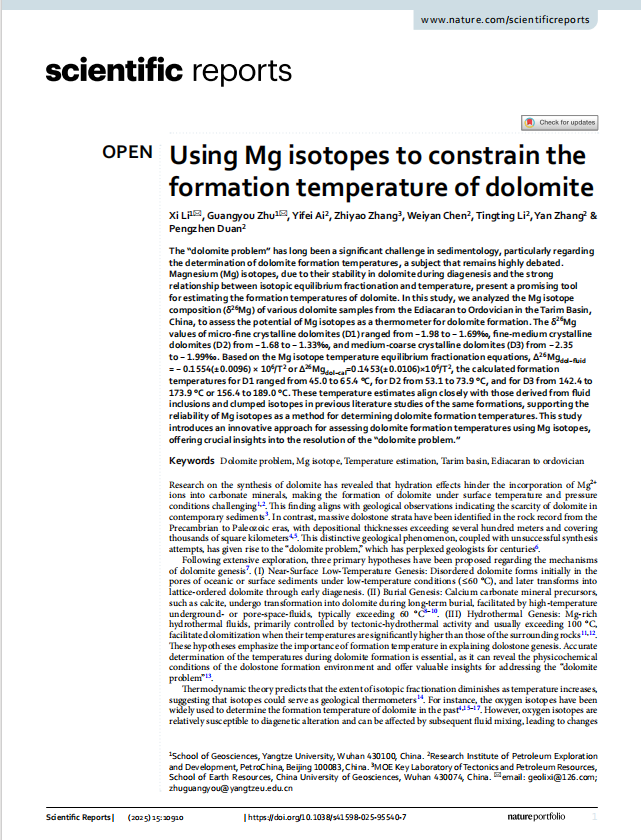 论文信息:Li, X., Zhu, G, Ai, Y., Zhang, Z., Chen, W., Li, T., & Duan, P. (2025). Using Mg isotopes to constrain the formation temperature of dolomite. Scientific Reports, 15(1), 1-17.