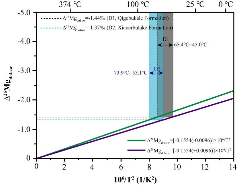 研究结果表明:微-粉晶白云石(D1)的δ26Mg值范围为−1.98到−1.69‰,细-中晶白云石(D2)为−1.68到−1.33‰,中-粗晶白云石(D3)为−2.35到−1.99‰。根据镁同位素平衡分馏温度方程,Δ26Mgdol−fluid= −0.1554(±0.0096) ×106/T2或 Δ26Mgdol−cal= 0.1453(±0.0106) × 106/T2,计算得到D1的形成温度范围为45.0到65.4°C,D2为53.1到73.9°C,D3为142.4到173.9°C 或 156.4到189.0°C(图3和图4)。这些温度估算值与先前文献中相同地层的流体包裹体和耦合同位素研究所得的温度结果接近,支持了镁同位素作为白云石形成温度测定方法的可靠性。本研究提出了一种创新的方法,利用镁同位素评估白云石的形成温度,为解决“白云石问题”提供了重要的见解。