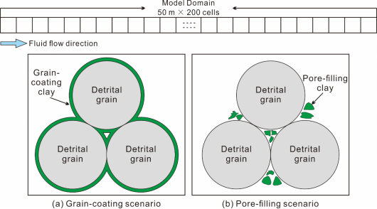 在砂岩储层地质学领域,黏土膜被认为能够显著抑制次生石英胶结物的生长(Li et al., 2025a),且近期研究表明其也可以有效降低被包裹长石颗粒的溶蚀速率、其本身也可以发生显著溶蚀(Li et al., 2025b),从而可以显著改变砂岩水-岩反应路径。由于在相似地质背景条件下,富黏土膜砂岩往往比贫黏土膜砂岩保存更高的孔隙度,因此是CO2地质封存的潜在优选目标层位;但有关黏土膜对水-CO2-岩石间化学反应的研究则较少。针对于此,采用数值模拟方法,通过对比包膜状黏土和孔隙充填状黏土的差异化学反应(图2),重点突出了黏土膜对水-CO2-岩石反应的改造。