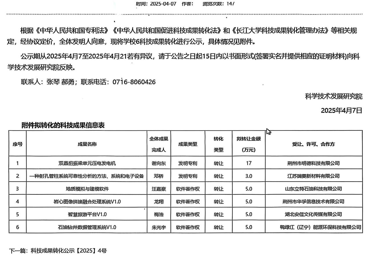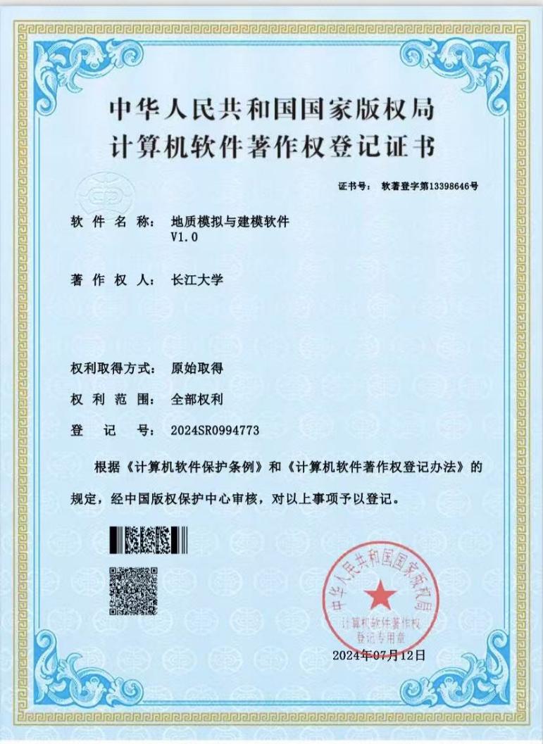 太阳成集团122ccvip硕士生汪嘉豪开发的软件《地质模拟与建模软件》取得了软件著作权并进行成果转化。太阳成集团122ccvip为第一申请人,硕士研究生汪嘉豪为第一发明人。