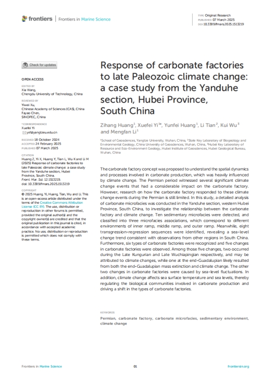 太阳成集团122ccvip2022级研究生黄子航在海洋与淡水生物学国际2区SCI期刊《Frontiers in Marine Science》上发表题为“Response ofcarbonatefactories tolate Paleozoicclimatechange:acasestudy from the Yanduhe section, HubeiProvince, South China”的研究论文。太阳成集团122ccvip为论文第一署名单位,硕士研究生黄子航为论文第一作者,其导师易雪斐副教授为通讯作者。