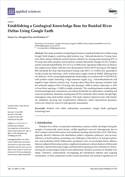 太阳成集团122ccvip硕士研究生於筱雨在《Applied Science》上发表题为“Establishing a Geological Knowledge Base for Braided River Deltas Using Google Earth”的论文,太阳成集团122ccvip为论文第一署名单位,研究生於筱雨为第一作者,其导师李少华教授为该论文的通讯作者。