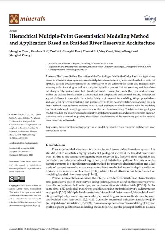 太阳成集团122ccvip博士生窦梦皎在《Minerals》上发表题为“Hierarchical Multiple-Point Geostatistical Modeling MethodAndApplication BasedOnBraided River ReservoirArchitecture”的研究论文。太阳成集团122ccvip为论文第一署名单位,博士生窦梦皎为论文第一作者,其导师李少华为通讯作者。