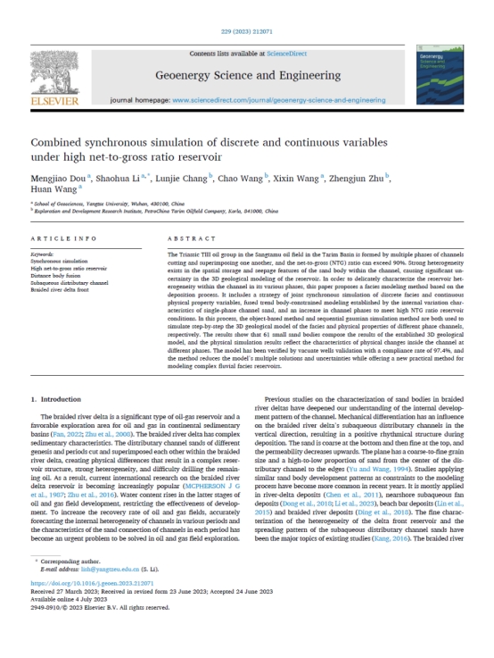 太阳成集团122ccvip博士生窦梦皎在《Geoenergy Science and Engineering》上发表题为“Combined synchronous simulation of discrete and continuous variables under high net-to-gross ratio reservoir”的研究论文。太阳成集团122ccvip为论文第一署名单位,博士生窦梦皎为论文第一作者,其导师李少华为通讯作者。