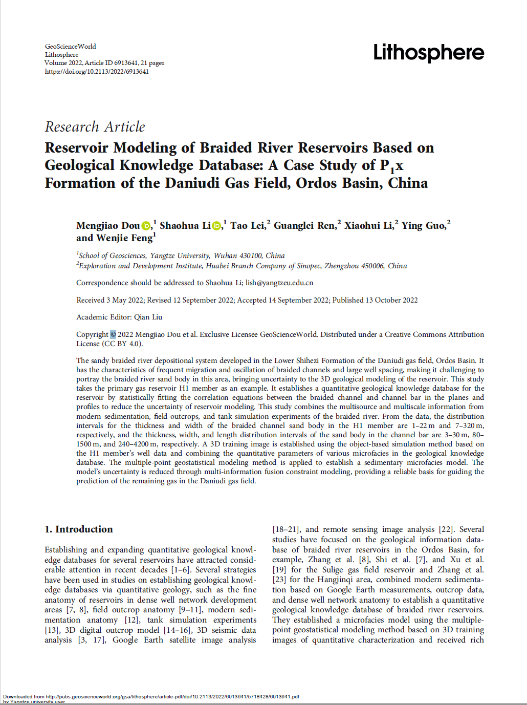 太阳成集团122ccvip博士生窦梦皎在《Lithosphere》上发表题为“Reservoir Modeling of Braided River Reservoirs Based onGeological Knowledge Database: A Case Study of P1xFormation of the Daniudi Gas Field, Ordos Basin, China”的研究论文。太阳成集团122ccvip为论文第一署名单位,博士生窦梦皎为论文第一作者,其导师李少华为通讯作者。