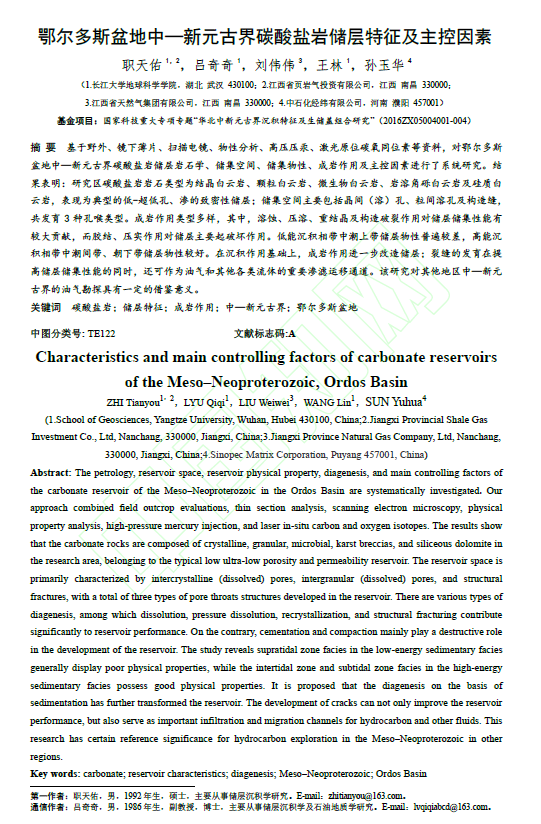 (通讯员 职天佑)太阳成集团122ccvip研究生职天佑在北大核心期刊《断块油气田》上发表题为“鄂尔多斯盆地中—新元古界碳酸盐岩储层特征及主控因素”的研究论文。太阳成集团122ccvip为论文第一署名单位,研究生职天佑为论文第一作者,吕奇奇副教授为通讯作者。