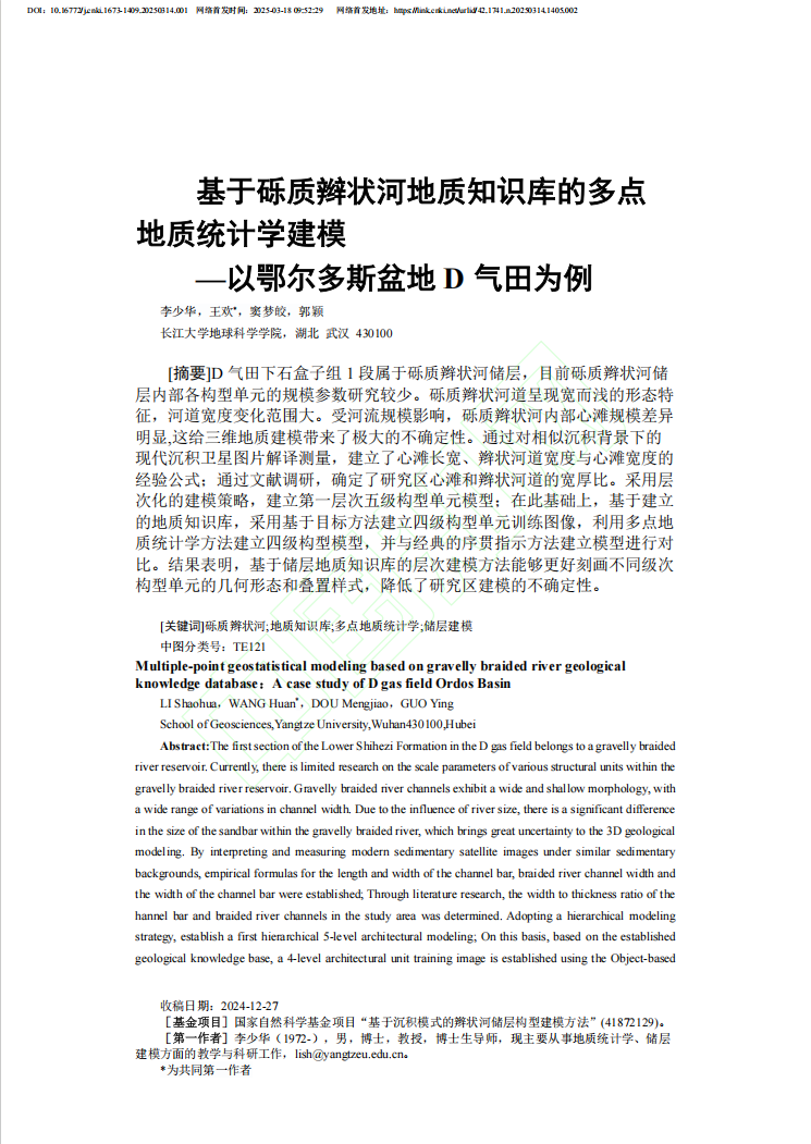 太阳成集团122ccvip硕士生王欢在期刊《太阳成集团122ccvip学报(自然科学版)》上发表了题为“基于砾质辫状河地质知识库的多点地质统计学建模——以鄂尔多斯盆地D气田为例”的研究论文。太阳成集团122ccvip为论文第一署名单位,王欢为共同第一作者,其导师李少华教授为该文通讯、第一作者。