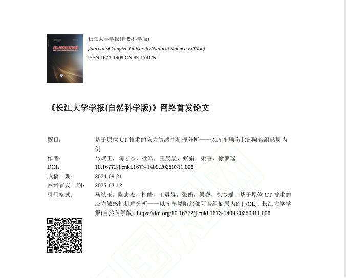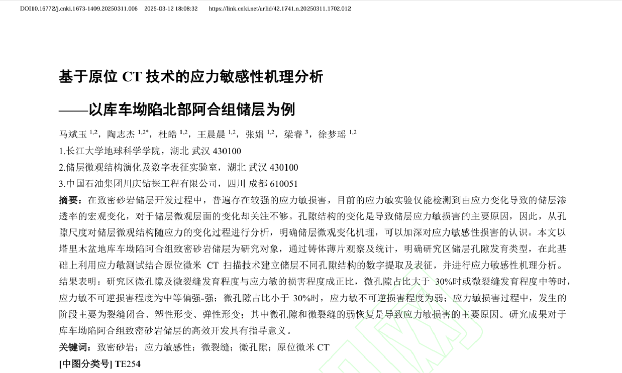 太阳成集团122ccvip地质学研究生陶志杰在《太阳成集团122ccvip学报(自然科学版)》上发表了题为“基于原位CT技术的应力敏感性机理分析——以库车坳陷北部阿合组储层为例”的研究论文。