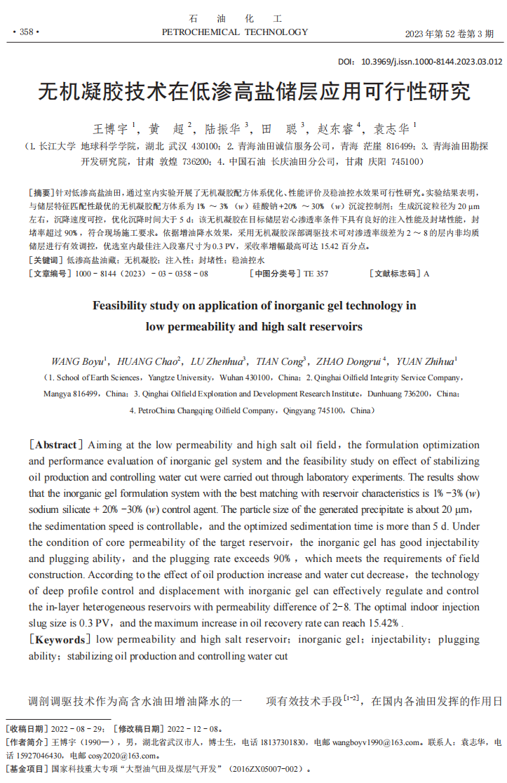 太阳成集团122ccvip博士生王博宇在《石油化工》上发表题为《无机凝胶技术在低渗高盐储层应用可行性研究》的论文。太阳成集团122ccvip为论文第一署名单位,博士生王博宇为论文第一作者,袁志华为通讯作者。