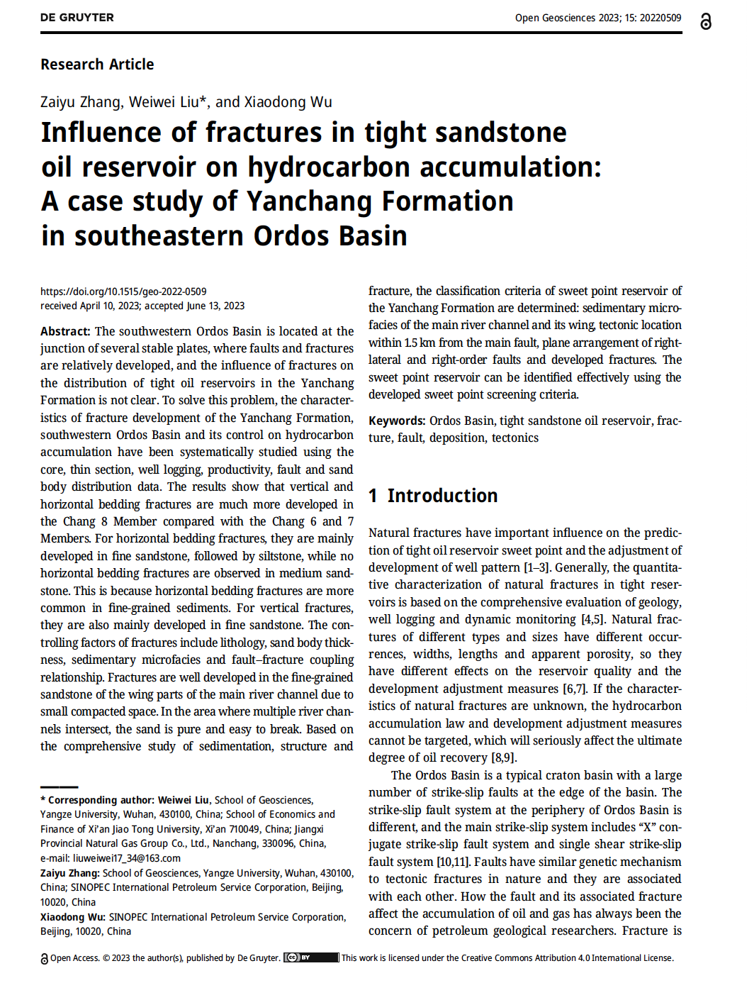 太阳成集团122ccvip硕士生张在玉在SCI收录期刊《Open Geosciences》上发表题为“Influence of fractures in tightsandstoneoil reservoir on hydrocarbon accumulation: A case study of Yanchang Formation in southeastern Ordos Basin”的研究论文,太阳成集团122ccvip为论文第一署名单位,硕士生张在玉为论文第一作者,指导老师刘伟伟为通讯作者。