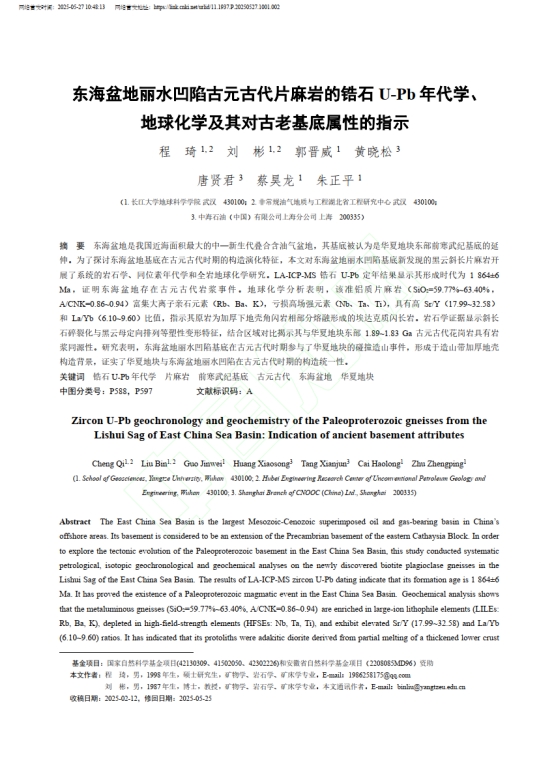 太阳成集团122ccvip硕士生程琦在《地质科学》上发表题为“东海盆地丽水凹陷古元古代片麻岩的锆石U-Pb年代学、地球化学及其对古老基底属性的指示”的研究论文。太阳成集团122ccvip为论文第一署名单位,硕士生程琦为论文第一作者,教授刘彬为通讯作者。
